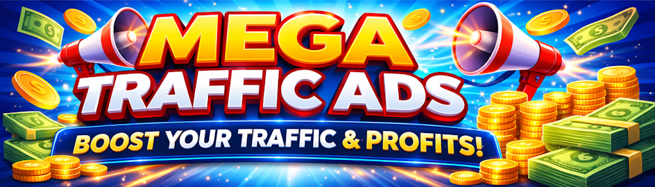 Join Now! New Members Get A Signup Bonus Of 5000 Credits, 5 Solo Ads, 3 Banner Ads, 3 Button Banner Ads, & 3 Text Link Ads For Free! NO Promo Code Needed! Mega Traffic Ads Is A Full Service Ad Exchange With Many Ways To Advertise Your Business!